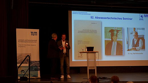 Ein persönliches Highlight: Unser Hauptgesellschafter Ralf Mitsdoerffer wurde im Rahmen des Seminars für sein langjähriges Engagement als Vorsitzender der Gesellschaft zur Förderung des Lehrstuhls für Siedlungswasserwirtschaft an der TUM geehrt.