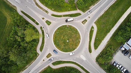 Neubau 4-armiger Kreisverkehrsplatz mit 40,0 m Durchmesser und umlaufenden Geh- und Radwegen, Provisorische Verkehrsführung im Zuge der Maßnahme in zwei Bauphasen, Oberflächenentwässerung
