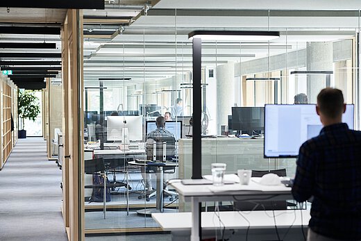 Das neue Bürokonzept unterstützt das Miteinander und stärkt den Teamgeist – viele offene Bereiche, die als Ruhe- oder Gemeinschaftsräume genutzt werden sowie zwei attraktive moderne Küchen laden zum Austausch unter Kollegen ein oder bieten außerhalb der Mittagszeit Rückzugsmöglichkeiten. Glaswände, geräumige und weitläufige Gänge sowie offene Arbeitspools radieren die Grenzen zwischen Kollegen wortwörtlich weg. Transparenz vereint mit einer Leichtigkeit – dieser Leitfaden zieht sich durch das ganze Büro und spiegelt unseren Charakter perfekt wider.